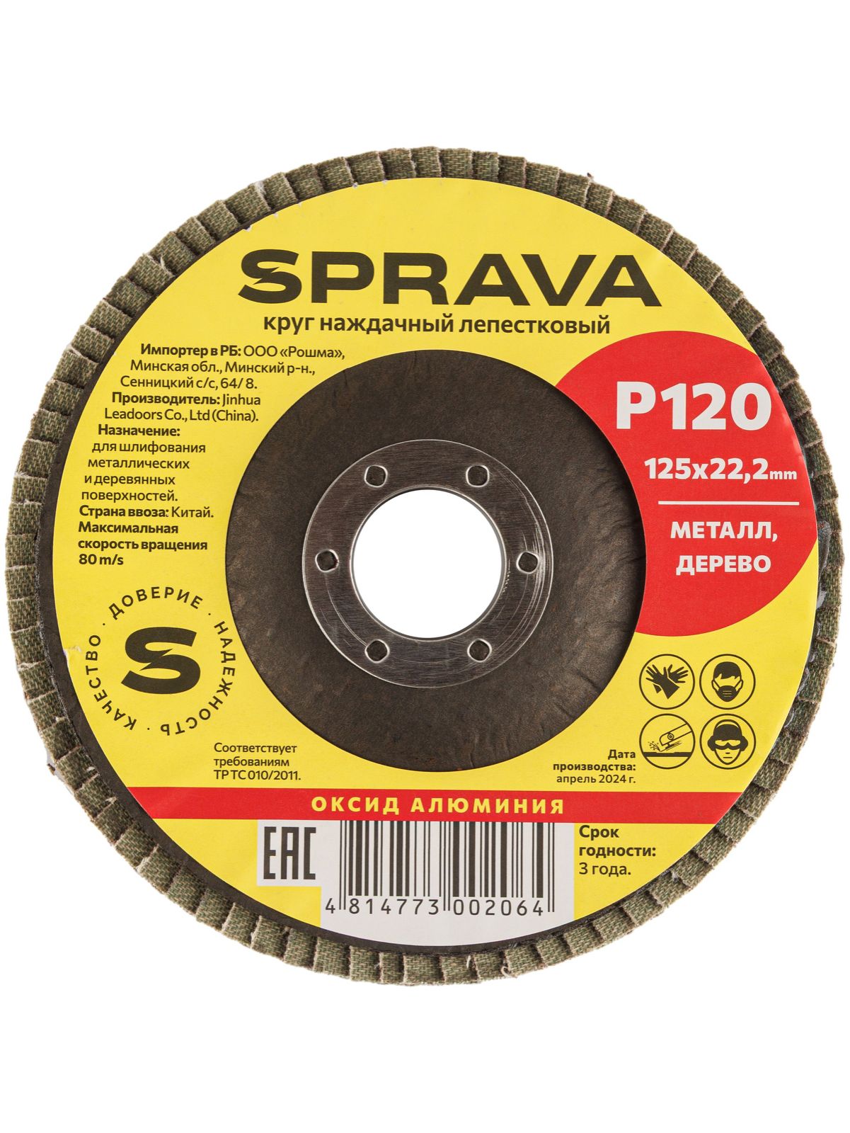 Круг наждачный лепестковый SPRAVA 125х22 мм, Р120, производство Китая — это инструмент для обработки металлических и деревянных поверхностей с высоким качеством и эффективностью. Он предназначен для плоского шлифования, обработки кромок и сварных швов деталей и конструкций.