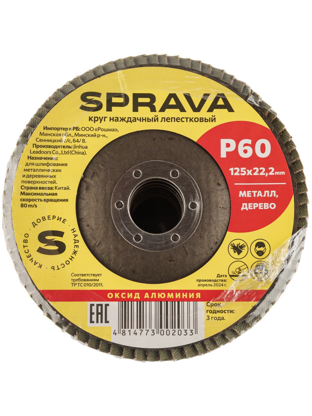 Круг наждачный лепестковый SPRAVA 125х22 мм, Р60, производство Китая — это инструмент для обработки металлических и деревянных поверхностей с высоким качеством и эффективностью. Он предназначен для плоского шлифования, обработки кромок и сварных швов деталей и конструкций.