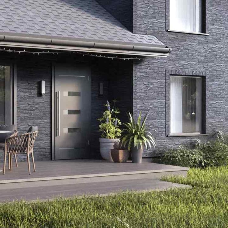 - Эффектный дизайн: имитация натурального камня создает ощущение уюта, тепла и естественной гармонии с окружающим ландшафтом, выгодно подчеркивает фактуру поверхности, обогащая архитектурный облик здания глубиной и сложностью восприятия.