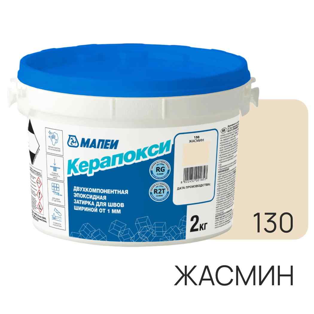 Фуга эпоксидная MAPEI Керапокси 130 Жасмин белый 2 кг (производство РФ) — высокогигиеничный двухкомпонентный состав на эпоксидной основе для заполнения швов плитки с исключительной химической стойкостью и долговечностью. Она обеспечивает гладкую непористую поверхность, устойчивую к кислотам, щелочам и механическим нагрузкам, идеально подходя для помещений с повышенными санитарными требованиями.
