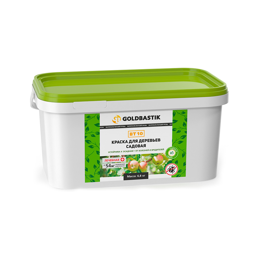 Краска для деревьев садовая GOLDBASTIK BT 10 Биотехническое средство для лечебно-профилактической окраски и дезинфекции ствола, ветвей плодовых и декоративных деревьев и кустарников в целях защиты и лечения от возбудителей болезней; защищает кору от резких перепадов температур; препятствует развитию мхов и лишайников; защищает от зимующих насекомых-вредителей; способствует заживлению ран, используется для замазывания распилов.