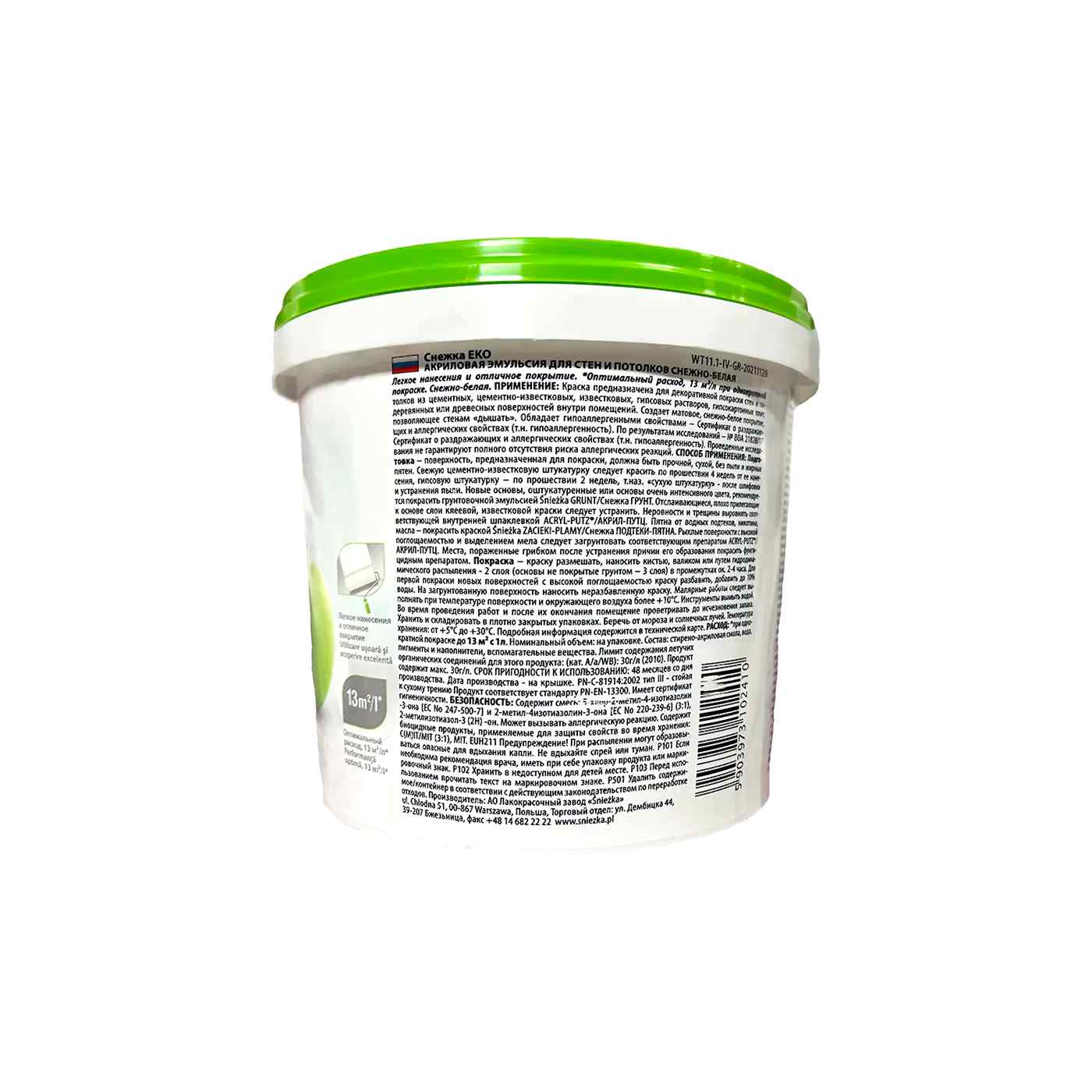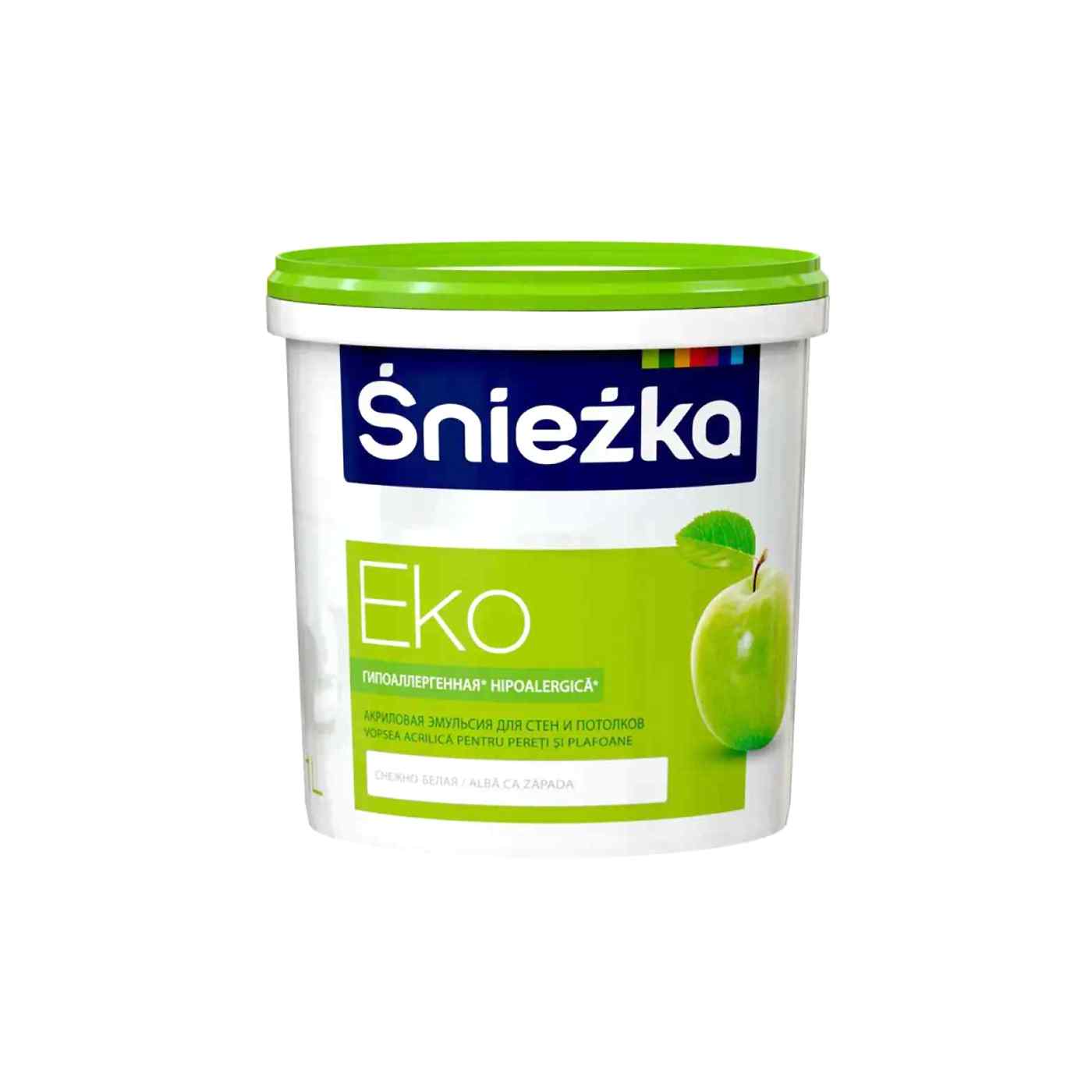 Краска интерьерная Sniezka EKO, белая — экологичная акриловая эмульсия для стен и потолков с идеальной укрывистостью и матовым финишем.