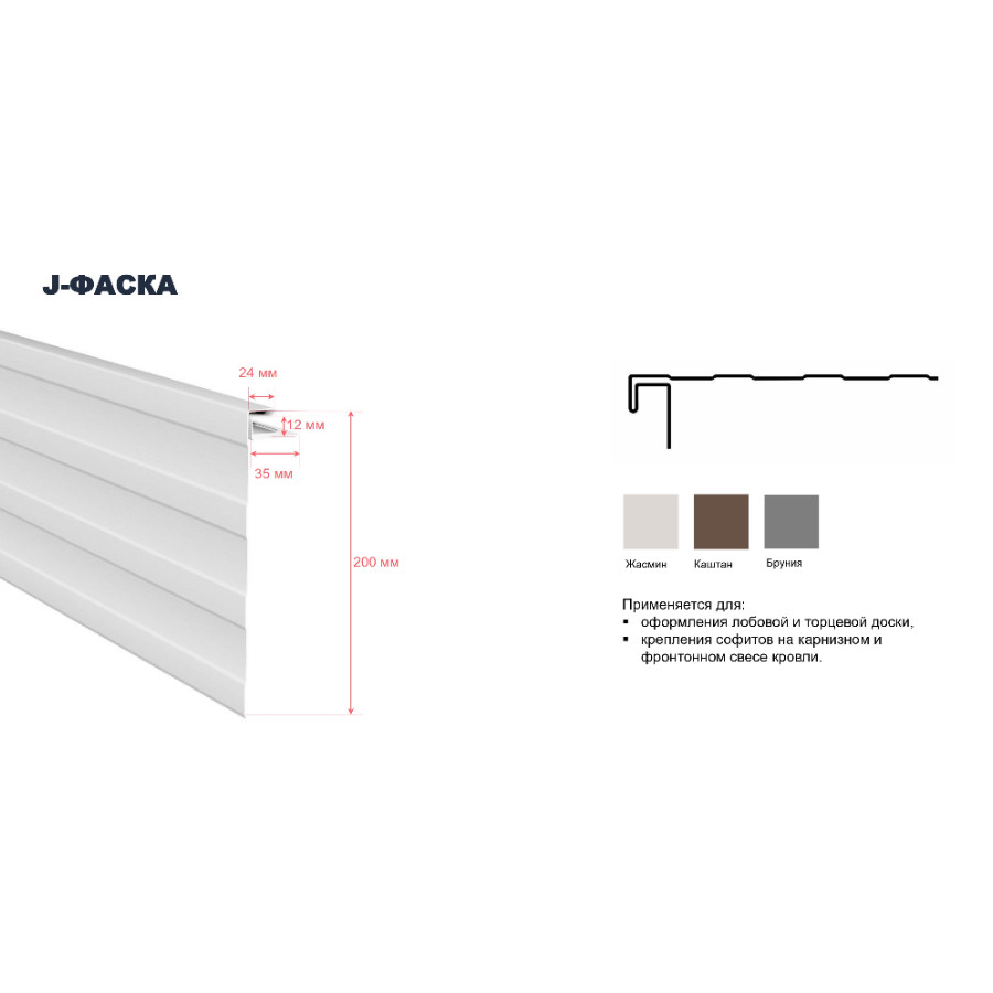 J-фаска ТехноНиколь Оптима, «Жасмин», длиной 3 метра — это прочный и эстетичный доборный элемент для профессионального монтажа софитов и оформления карнизных и фронтонных свесов кровли. Изготовленная из высококачественного ПВХ, фаска обеспечивает надёжную фиксацию софитов и защищает конструкцию от влаги, пыли и насекомых.