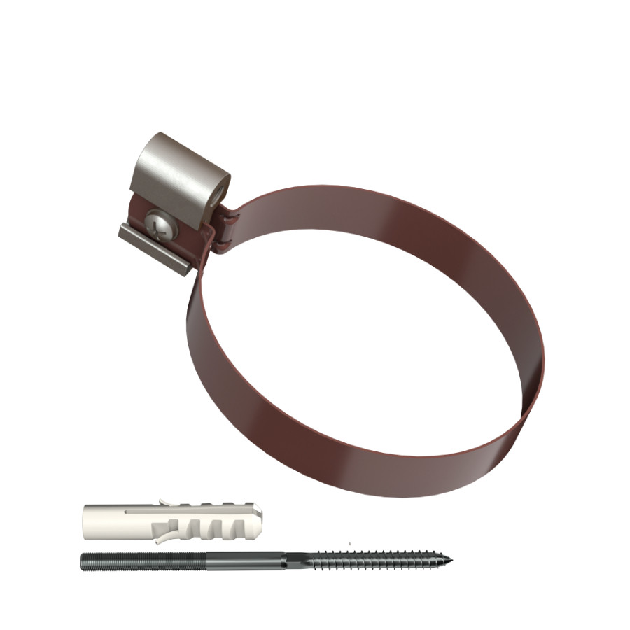 Хомут трубы ТехноНиколь ПВХ L=140, металлический, коричневый — надежный крепежный элемент водосточной системы, предназначенный для прочного и долговечного крепления водосточных труб диаметром 82 мм к фасаду или конструкции здания.