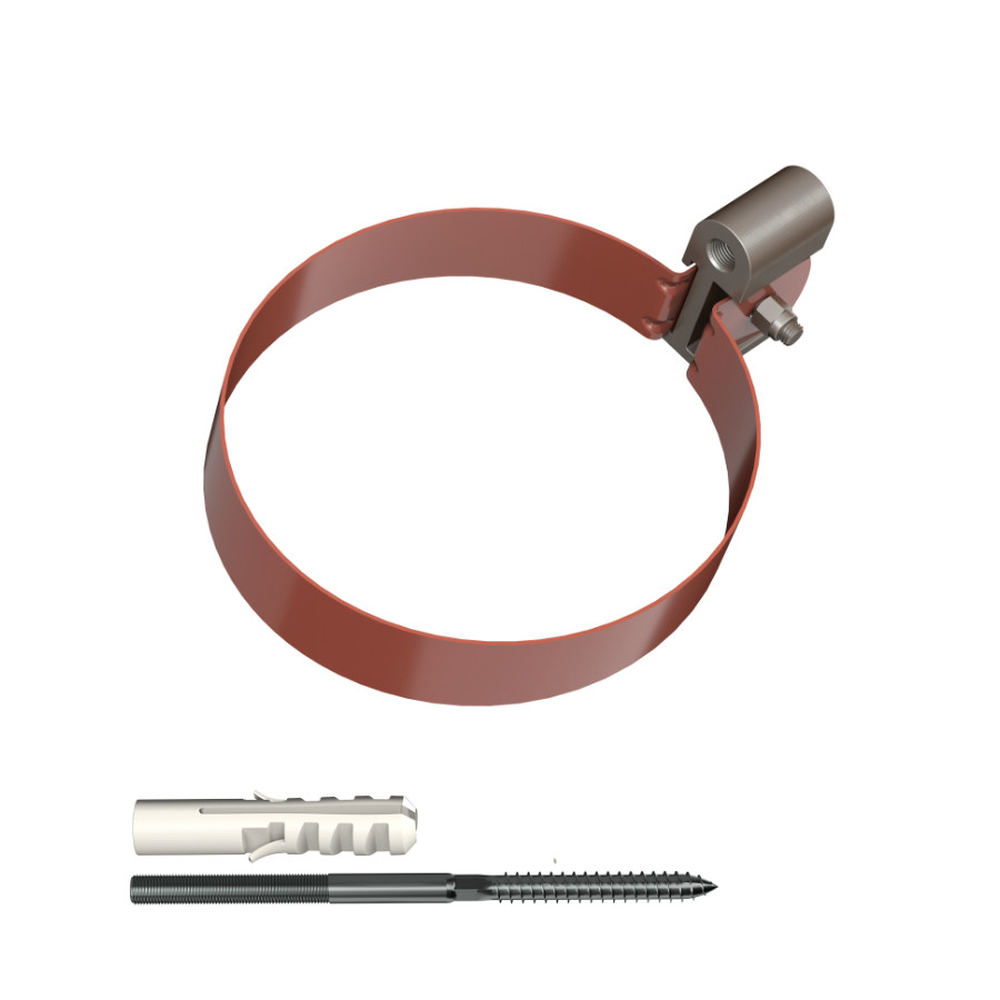 Хомут трубы ТехноНиколь ПВХ L=140, металлический, красный — надежный крепежный элемент водосточной системы, предназначенный для прочного и долговечного крепления водосточных труб диаметром 82 мм к фасаду или конструкции здания.
